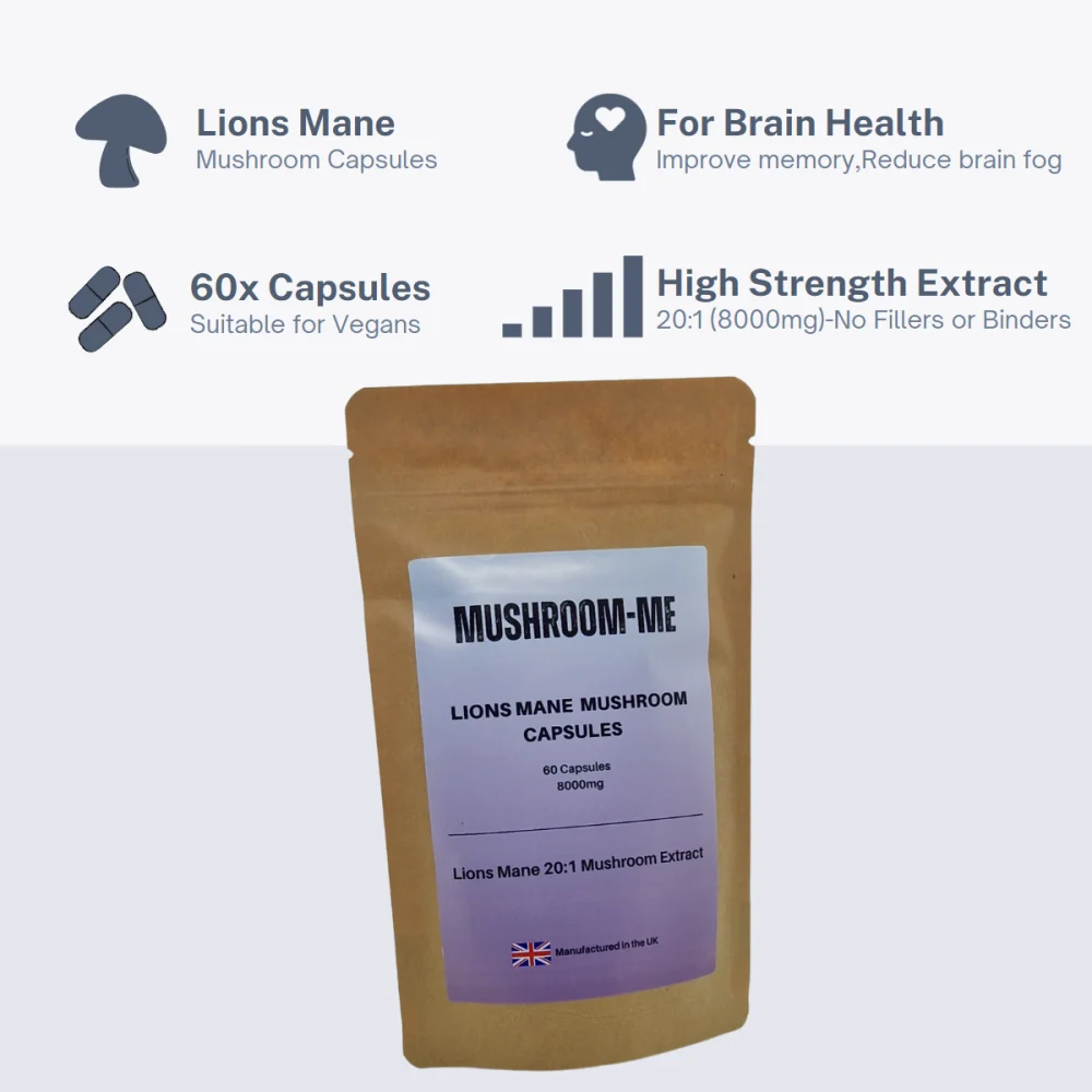 - 60x High Strength Lions Mane Mushroom Capsules.